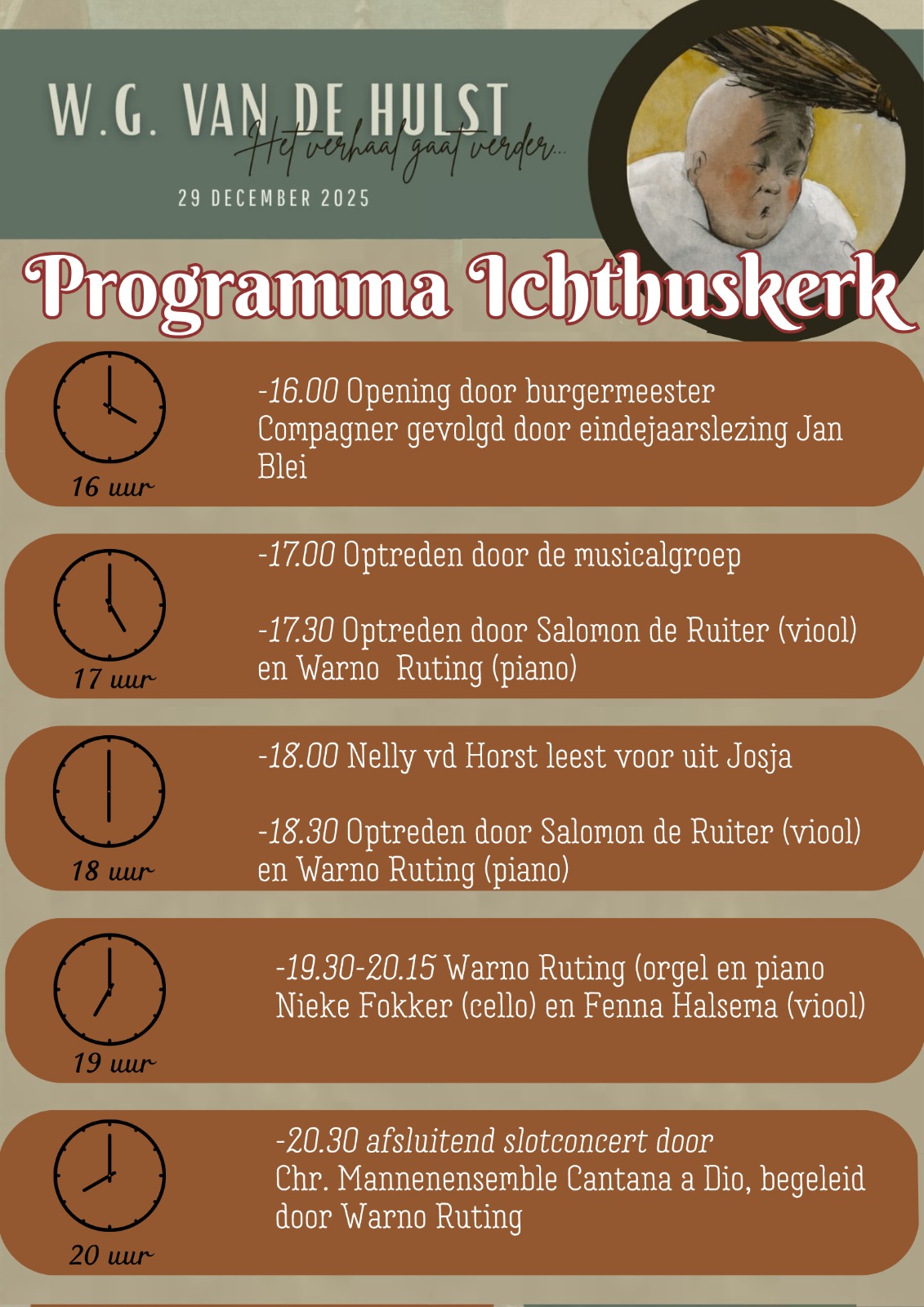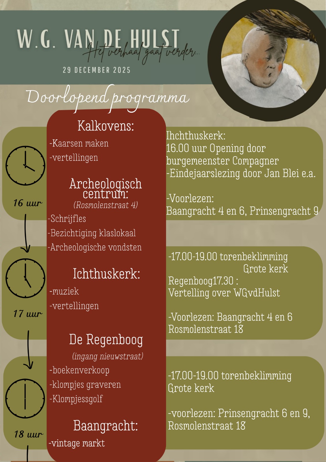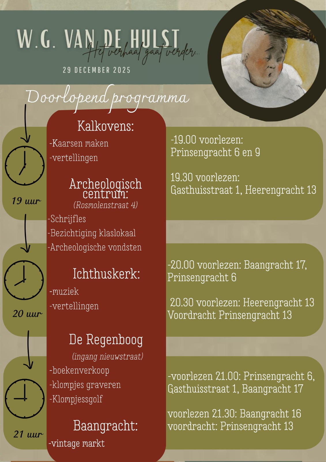 Het festival is gratis toegankelijk, maar uiteraard zijn giften welkom! Kom dwalen langs de grachten, luister, kijk, beleef – en laat je meevoeren in de wereld van W.G. van de Hulst. Want het verhaal gaat verder…!